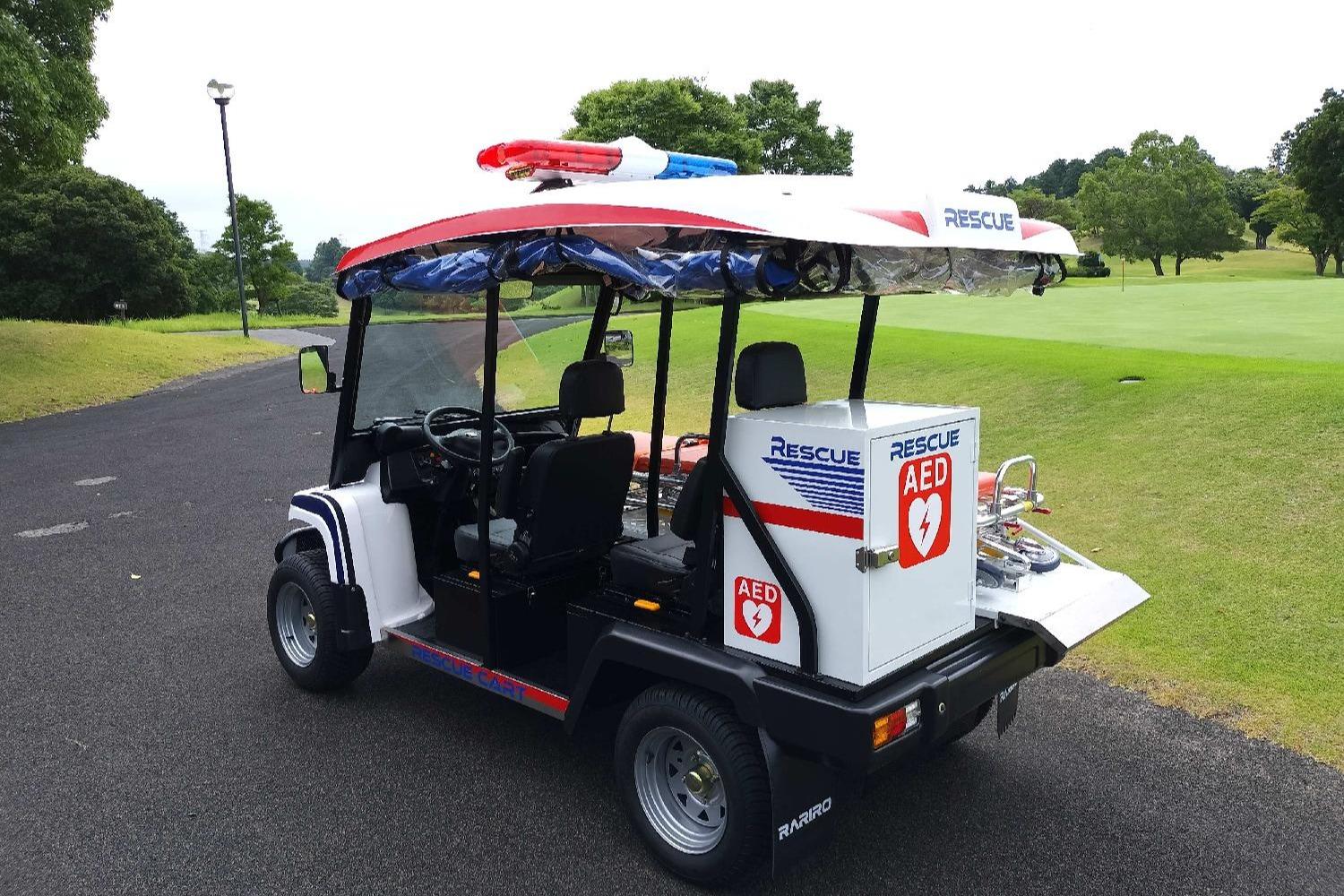 立ちくらみ、めまいなどの初期症状が見られた際には、レスキューカートが迅速に駆け付けることで、重症化を防ぐことができます。後部のボックスにはAEDや救急箱、氷などを載せることができ、応急処置が可能です。